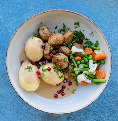 HalalHALAL- Kjøttboller HALAL (erteprotein) poteter, fløtesaus, Sommerblanding