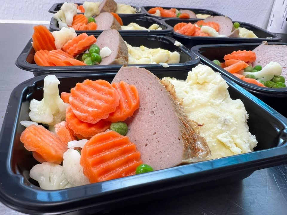 | Kjøttpudding (KYLLING/KALKUN) med potetmos (LAKTOSEFRI), blomkål/gulrøtter/erter KJØTTPUDING: Kjøtt av kylling og kalkun, vann, potetmel, salt, dekstrose, krydder (inkl. paprika), gjærekstrakt, hydrolisert vegetabilsk protein (soya), konserveringsmiddel E261, E326. Potet, Millac (Laktosefri), grønnsaksbuljong , blomkål, erter, gulrøtter Allergener: Soya, Lupin, Melkeprotein (melk), Laktose og Melkeprotein, PKU alternativ | 280 |